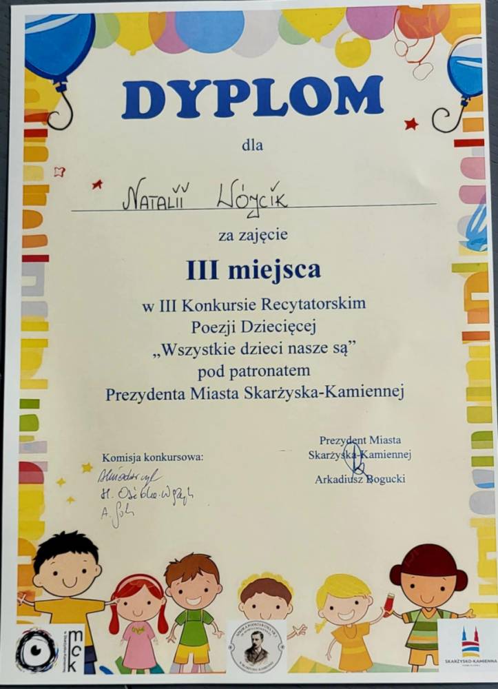 Natalka Wócik zajęła III miejsce w III Konkursie Recytatorskim Poezji Dziecięcej "Wszystkie dzieci nasze są" . Nasza reprezentantka mogła liczyć na wsparcie i doping całej swojej klasy, która mocno trzymała za Nią kciuki. Gratulujemy serdecznie!