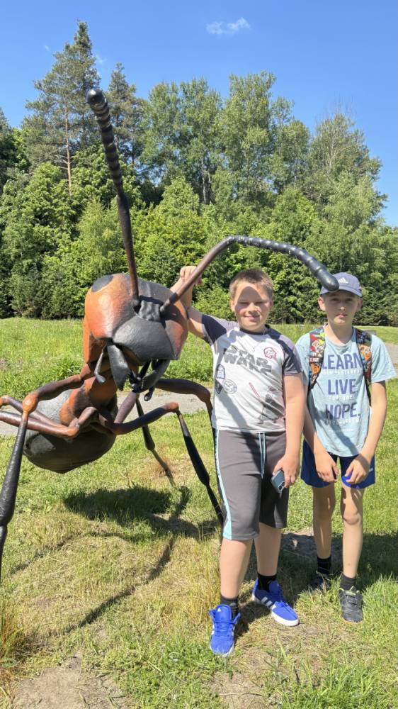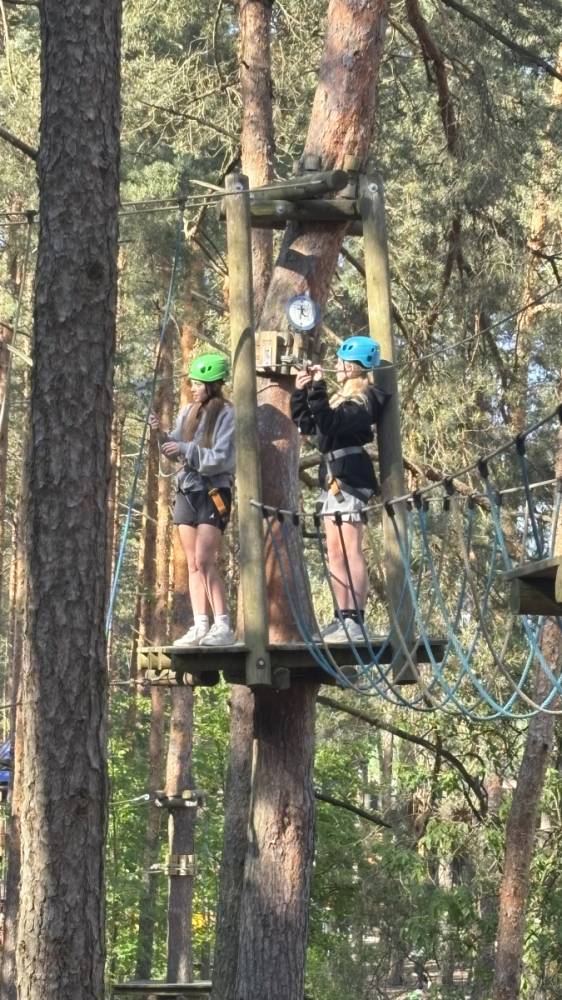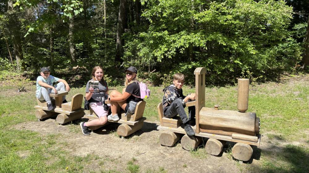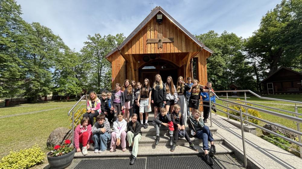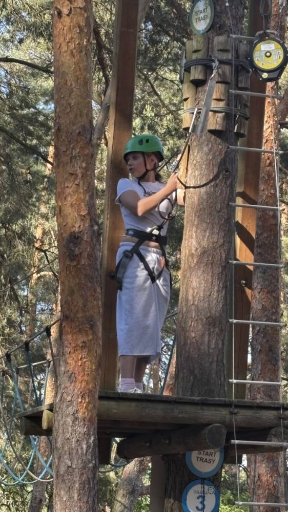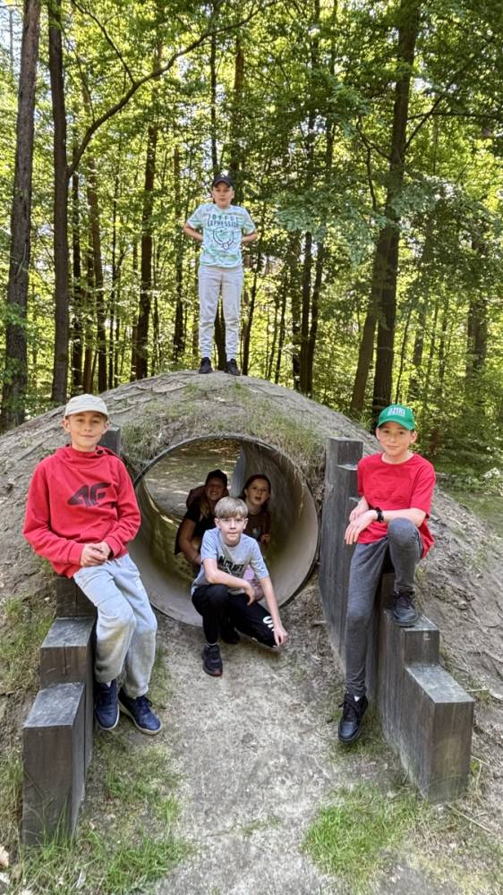 W dniach 26 – 28.05.2025 r. uczniowie klas 5 – 6 pod opieką p. Marzeny Tomaszewskiej i p. Agnieszki Pakuły wybrali się na trzydniową wycieczkę do urokliwego Janowa Lubelskiego. Swoją przygodę rozpoczęli od warsztatów w Ośrodku Edukacji Ekologicznej, gdzie poznali walory przyrodnicze Lasów Janowa Lubelskiego, dowiedzieli się, jak wygląda praca leśników, jakie rośliny i zwierzęta zamieszkują te tereny, a także jak dbać o środowisko. To była świetna okazja, by nauczyć się czegoś nowego i zrozumieć, jak ważne jest chronienie przyrody. Spacerując ścieżką dydaktyczną obok Ośrodka zobaczyli również tabor kolejki leśnej i piękne łąki kwietne, które zachwycają swym zapachem i wyglądem. Kolejnym punktem wycieczki było multimedialne centrum ZOOM Natury. Ekspozycja główna wprowadziła uczestników wycieczki w świat przyrody oraz gatunków znajdujących się pod ochroną, ukazując naturalne dziedzictwo przyrody za pomocą nowoczesnych środków. Multimedia przybliżyły najważniejsze zagadnienia z zakresu botaniki i zoologii. Pod specjalnie zaprojektowanymi soczewkami i kamerami uczniowie mogli zajrzeć w niewidziane gołym okiem tajniki natury. Podziwiali zbudowaną z 60 000 klocków LEGO model elektrowni wodnej, składający się z tamy, górskiego miasteczka, zalewu z plażą, portu oraz latarni morskiej. Po zajęciach przyrodniczych przyszedł czas na sprawdzenie swoich umiejętności fizycznych. Pod czujnym okiem instruktorów uczniowie bezpiecznie pokonywali przeszkody na wysokościach w parku linowym sprawdzali swoją odwagę, zręczność i koordynację ruchową. Jednocześnie uczyli się, jak ważne jest zachowanie ostrożności i współpraca z innymi. Park linowy to nie tylko świetna zabawa, ale także doskonała okazja do rozwoju pewności siebie i pokonywania własnych lęków. Wszyscy spisali się na medal. Po długim i pełnym wyzwań dniu wszyscy zasnęli w swoich łóżeczkach.