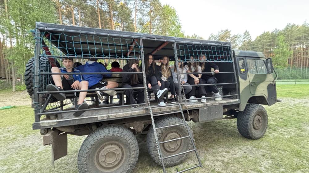 Po południu odbyła się olimpiada sportowa a następnie emocjonująca przejażdżka samochodami off-road po malowniczych lasach Janowa Lubelskiego. Była to niesamowita okazja, by poczuć dreszczyk emocji i zobaczyć okolicę z zupełnie innej perspektywy. Pod opieką doświadczonych kierowców uczniowie wraz z opiekunami przemierzali leśne ścieżki, pokonując błotniste zakręty, kamieniste podjazdy i nierówne tereny. Dla wielu uczniów była to pierwsza taka przygoda. Przejażdżka off-road to nie tylko świetna zabawa, ale także okazja do nauki o pojazdach terenowych i środowisku naturalnym. Uczniowie mieli okazję zobaczyć, jak wygląda praca kierowców w trudnych warunkach i jak ważne jest zachowanie ostrożności podczas jazdy w terenie. To doświadczenie na długo pozostanie w ich pamięci jako jedna z najbardziej ekscytujących atrakcji całej wycieczki! Po dniu pełnym wrażeń wszyscy z apetytem zajadali kiełbaski z ogniska i śpiewali piosenki.