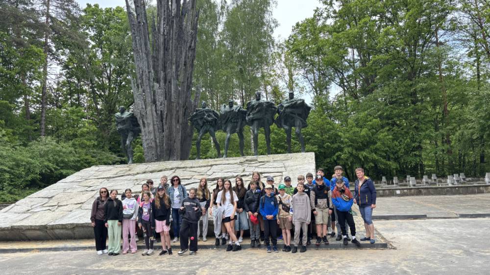 Trzeciego dnia Janów Lubelski powitał nas bezchmurnym niebem i pięknym słońcem. Po pysznym śniadaniu kolejką turystyczną uczestnicy wycieczki dojechali do stadniny koników biłgorajskich w miejscowości Szklarnia. Jest to jedno z niewielu miejsce w Polsce, gdzie można zobaczyć te unikalne zwierzęta, które są bliskimi krewniakami dzikich tarpanów. Następnym punktem wycieczki było Porytowe Wzgórze – historyczne miejsce, które odgrywało kluczową rolę w historii regionu. To właśnie tutaj miała miejsce największa bitwa w Janowie Lubelskim, co czyni to miejsce wyjątkowym i pełnym historycznego znaczenia. Miejsce to nie tylko uczy o historii, ale także pozwala zrozumieć, jak ważne jest pielęgnowanie pamięci o przeszłości i szanowanie bohaterów. Porytowe Wzgórza to miejsce, które łączy edukację z refleksją i pozwala młodym ludziom lepiej zrozumieć korzenie swojej lokalnej historii.
