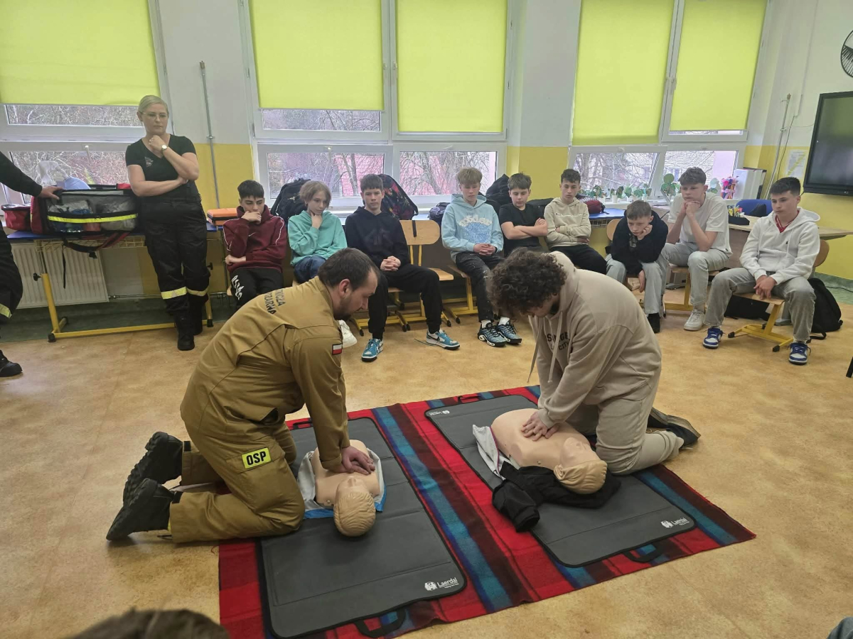 26 marca 2026 r. uczniowie klasy 8a uczestniczyli w warsztatach z zakresu udzielania pierwszej pomocy, które zostały przeprowadzone przez funkcjonariuszy Ochotniczej Straży Pożarnej KSRG w Bliżynie.