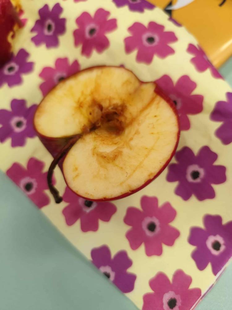 Dzieci oglądały różne odmiany jabłek, dotykały, opisywały ich kształt i kolor, a także odkrywały, co kryje się w środku. Pestki stały się bohaterkami eksperymentu – część z nich trafiła na wilgotną watę, byśmy mogli obserwować, jak kiełkują.