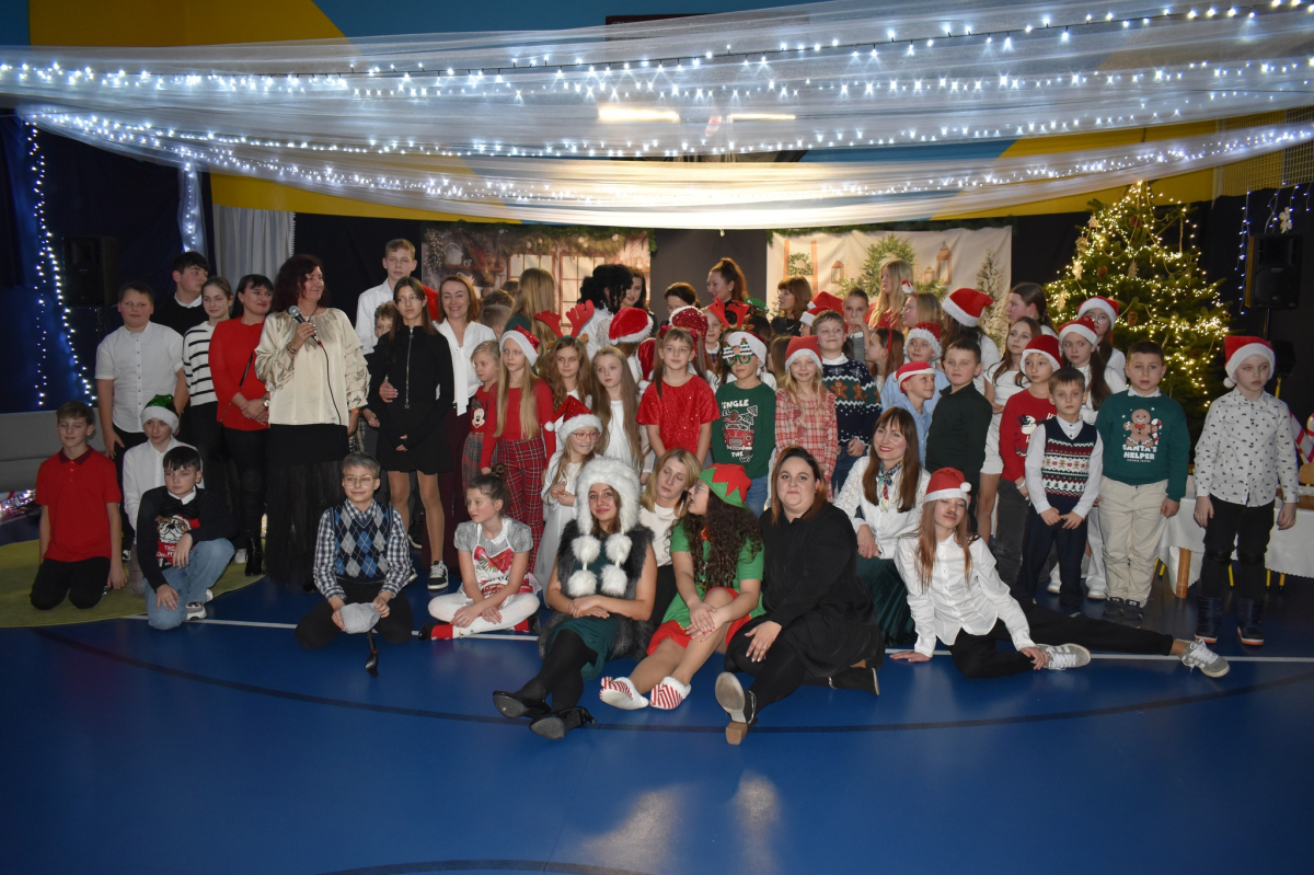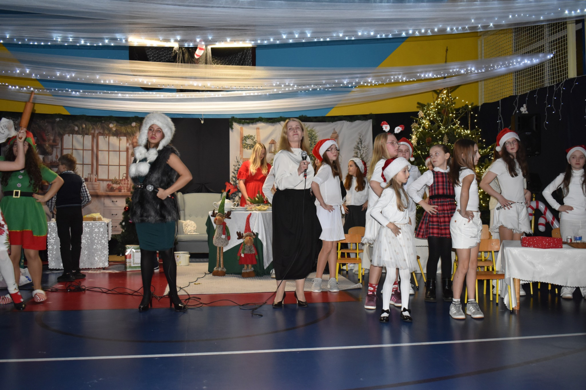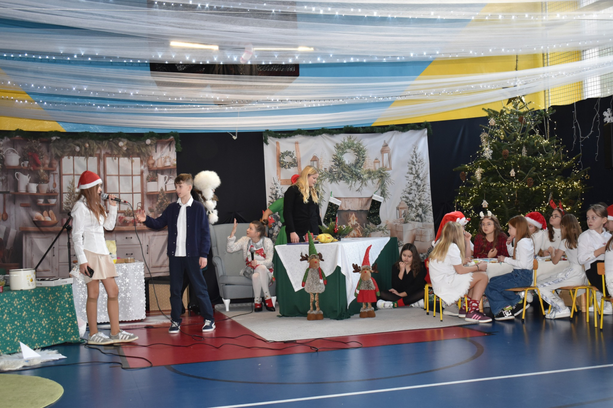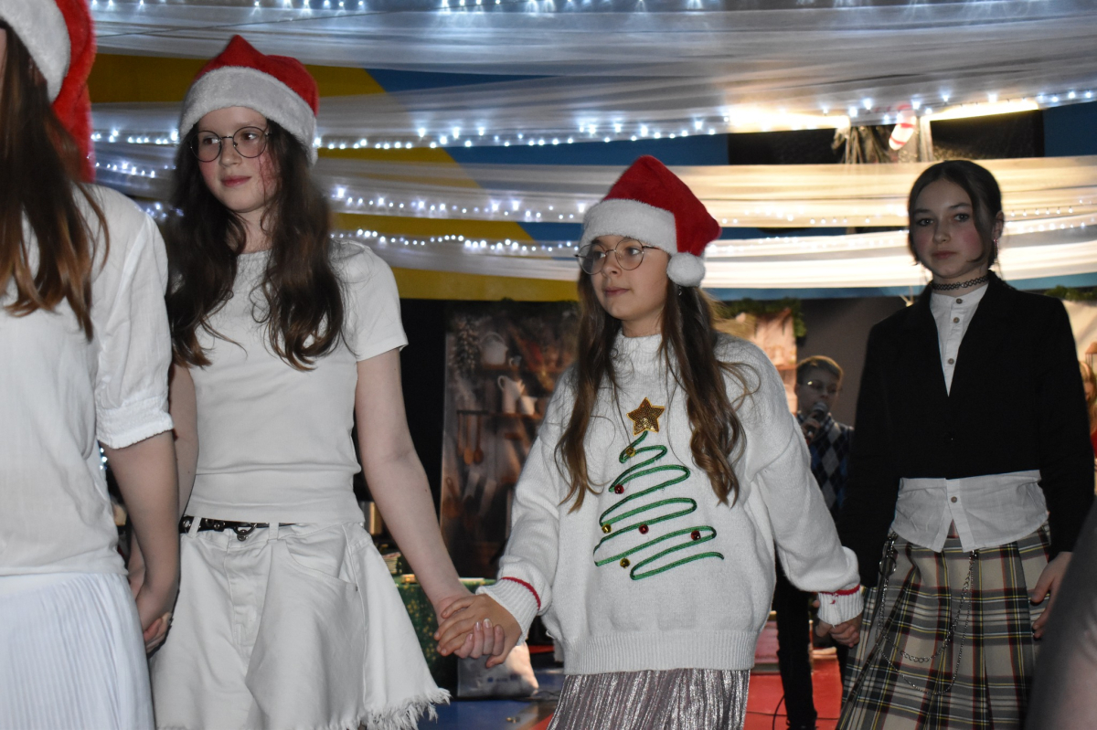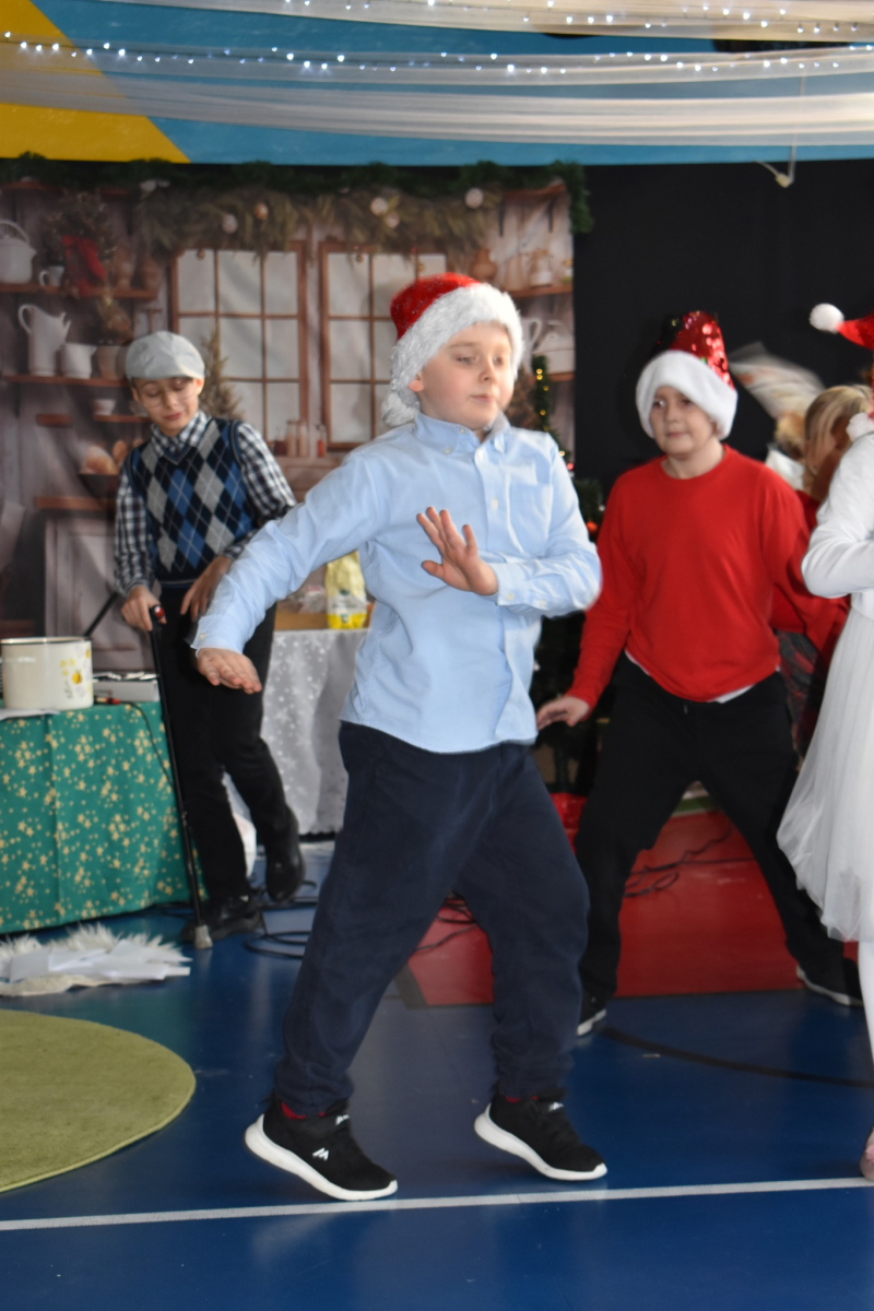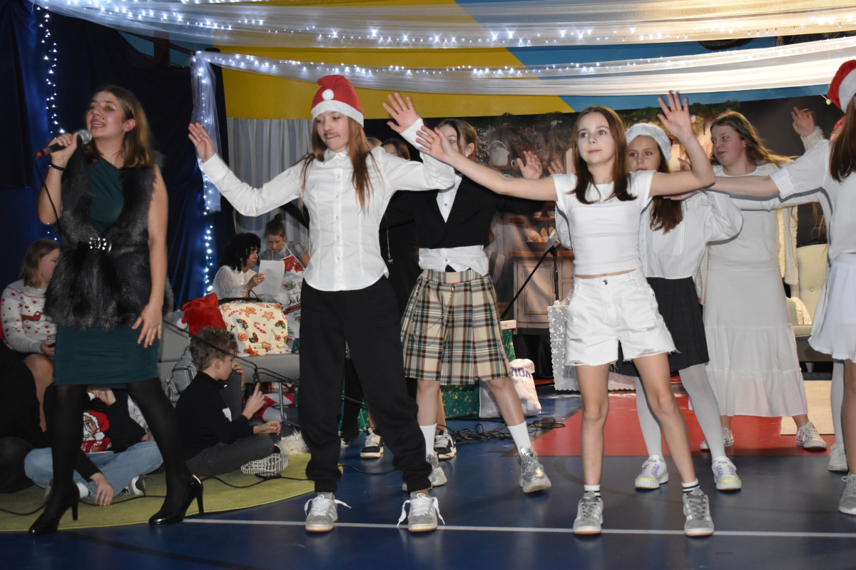 Spektakl miał formę prawdziwego musicalu, łączącego grę aktorską, taniec oraz aż 11 piosenek, które prowadziły widzów przez kolejne sceny opowieści. Dynamiczne układy taneczne przeplatały się z dialogami pełnymi humoru i refleksji, a muzyka nadawała rytm historii opowiadającej o współczesnych Świętach – pełnych pośpiechu, ekranów i codziennego chaosu, ale też bliskości, nadziei i potrzeby bycia razem. Na scenie zaprezentowali się uczniowie klas I–VIII, zachwycając naturalnością, energią i ogromnym zaangażowaniem.