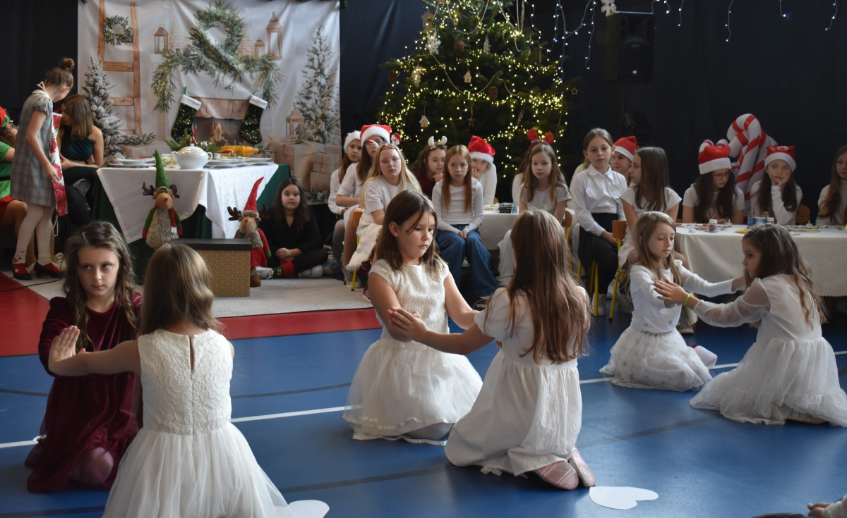 Po spektaklu uczestnicy wydarzenia spotkali się przy wspólnym wigilijnym poczęstunku, przygotowanym dzięki zaangażowaniu Rady Rodziców oraz Grona Pedagogicznego. Był to czas rozmów i składania świątecznych życzeń, sprzyjający nawiązywaniu relacji i integracji międzypokoleniowej, umacnianiu więzi między szkołą a jej otoczeniem, a jednocześnie naturalne dopełnienie wieczoru, który sprzyjał bliskości i wzajemnej życzliwości.
