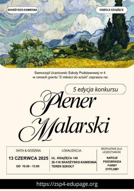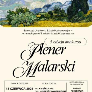 W dniu 13 czerwca na terenie Szkoły Podstawowej nr 4 w Skarżysku - Kamiennej odbyła się V edycja Gminnego Pleneru Malarskiego, zorganizowana w ramach projektu „Aktywizacja młodzieży województwa świętokrzyskiego” – „Z miłości do sztuki”. Tegoroczne wydarzenie przebiegało pod hasłem „Krajobraz wiosenny”.